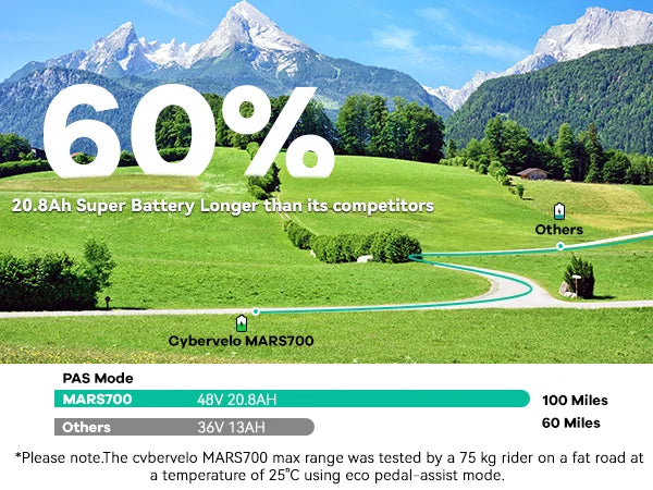 2.48V 20.8AH Large Capacity Removable Battery: The commuter electric mountain bike is equipped with 48V 20.8AH battery, which increases the mileage by 60%. When charging this e-bike, it can effortlessly provide 80 miles of range for your most adventurous riding excursions. Cybervelo E-bike, perfect for daily commuting, has a detachable design that enables the battery to be easily removed from the e-bike and charged indoors