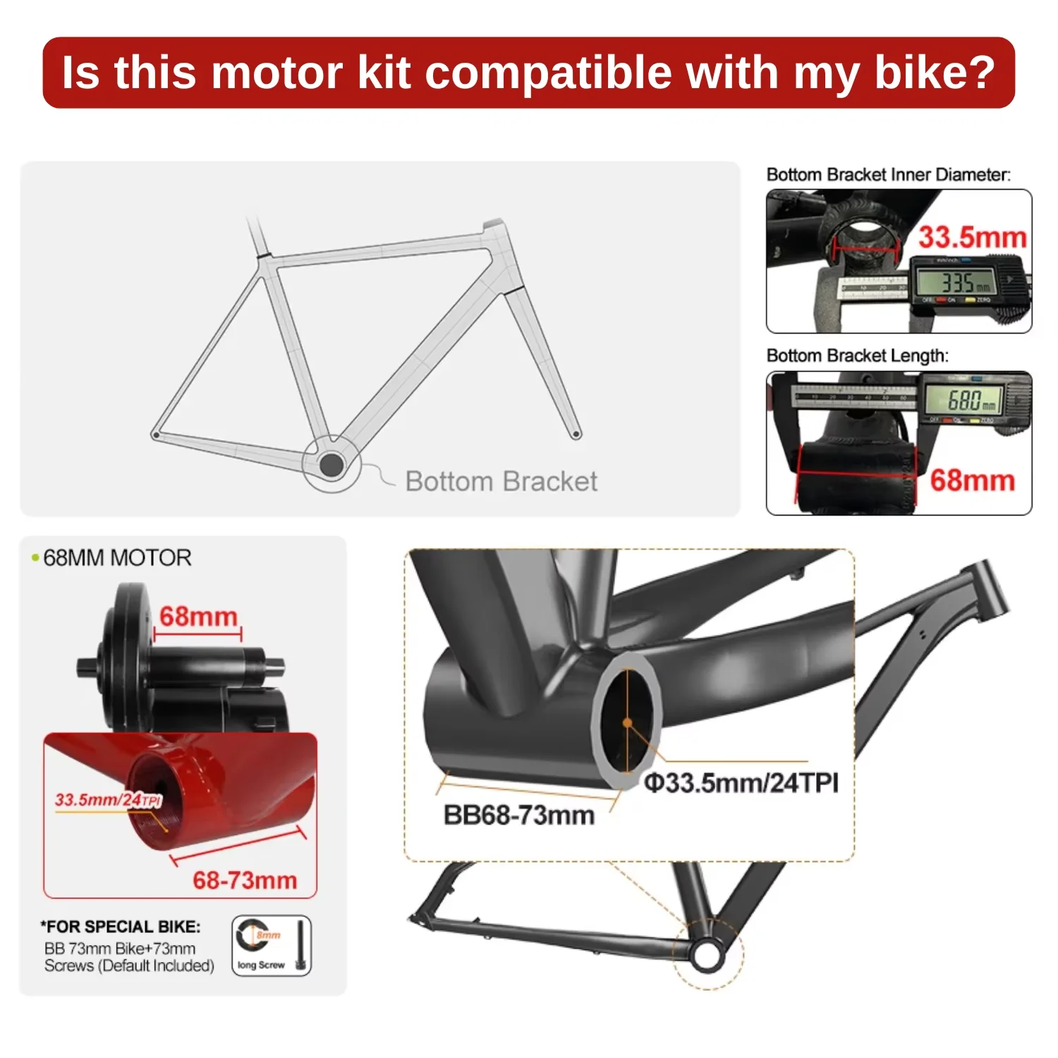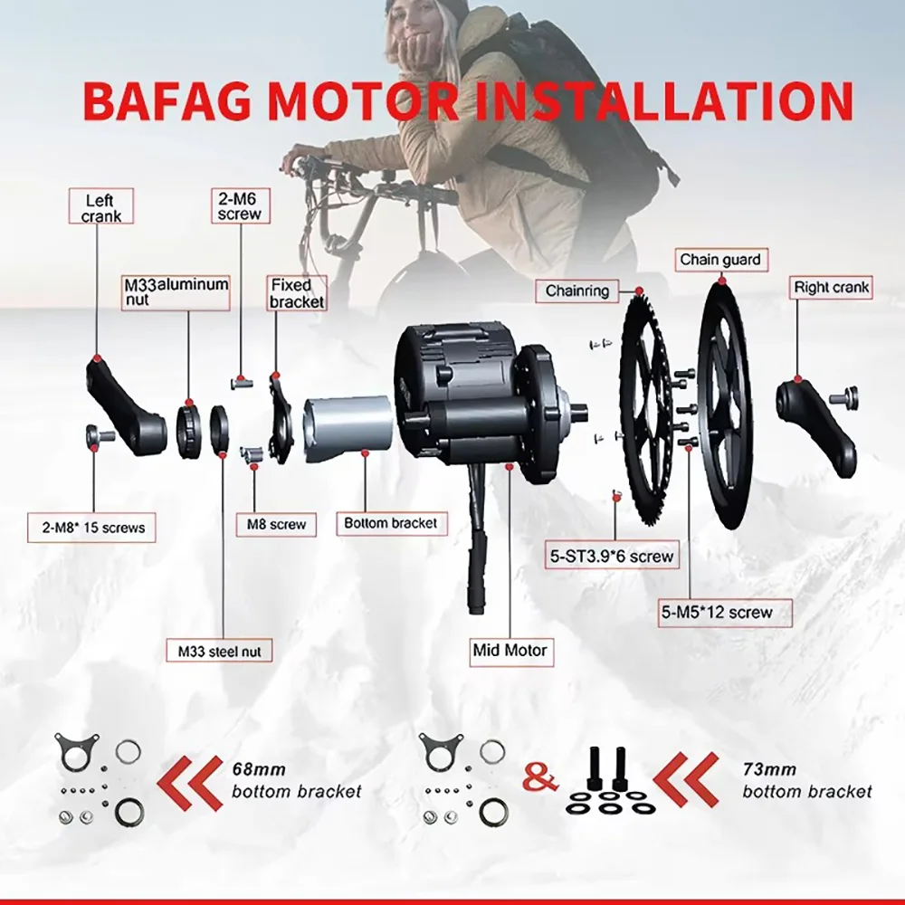 Q: How do I know if this mid drive motor fits for my bike?A: This 68mm mid drive motor fits for the bike with 68mm (2.68inch) - 73mm (2.87inch) wide bottom bracket, we'll send extra install accessoreis for 73mm bottom bracket. The inner diamater of the bracket should be not less than 33.5mm.Q: How do I confirm whether I need the brake levers or the brake sensors?