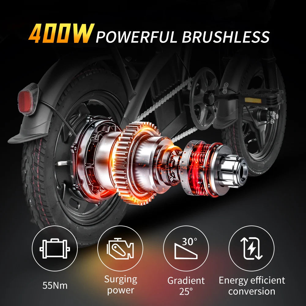 DEEPOWER Electric Bike for Adult 600W Peak Motor, 21MPH Folding Ebike, 14" Electric Bicycles, 3 Levels Assist, Multi-Shock Ebike