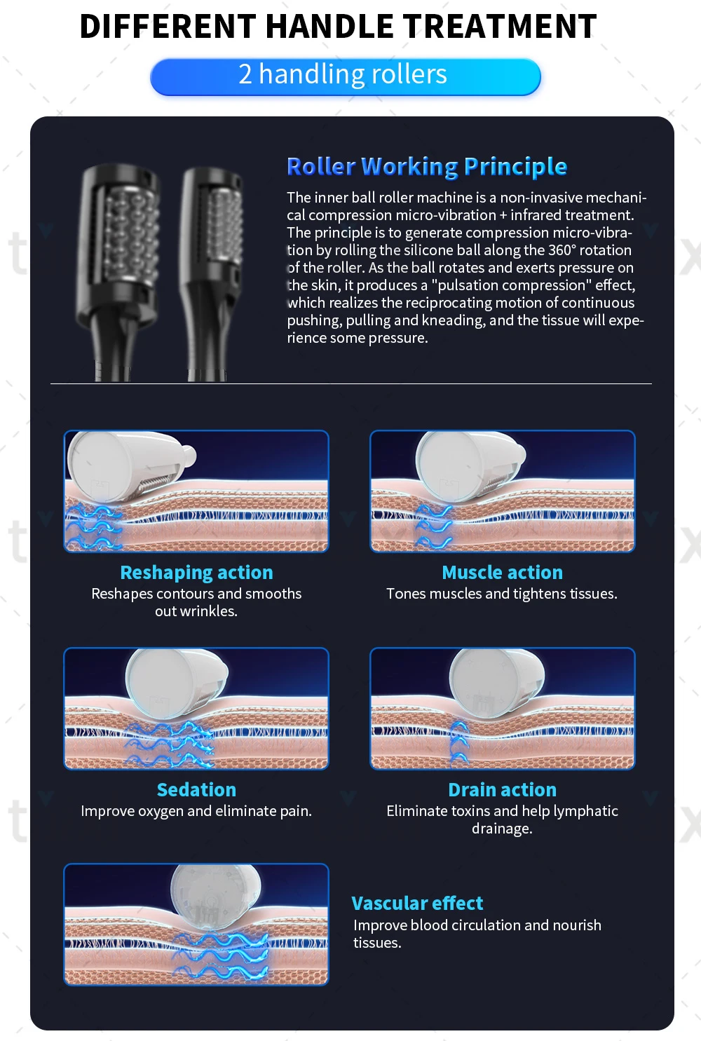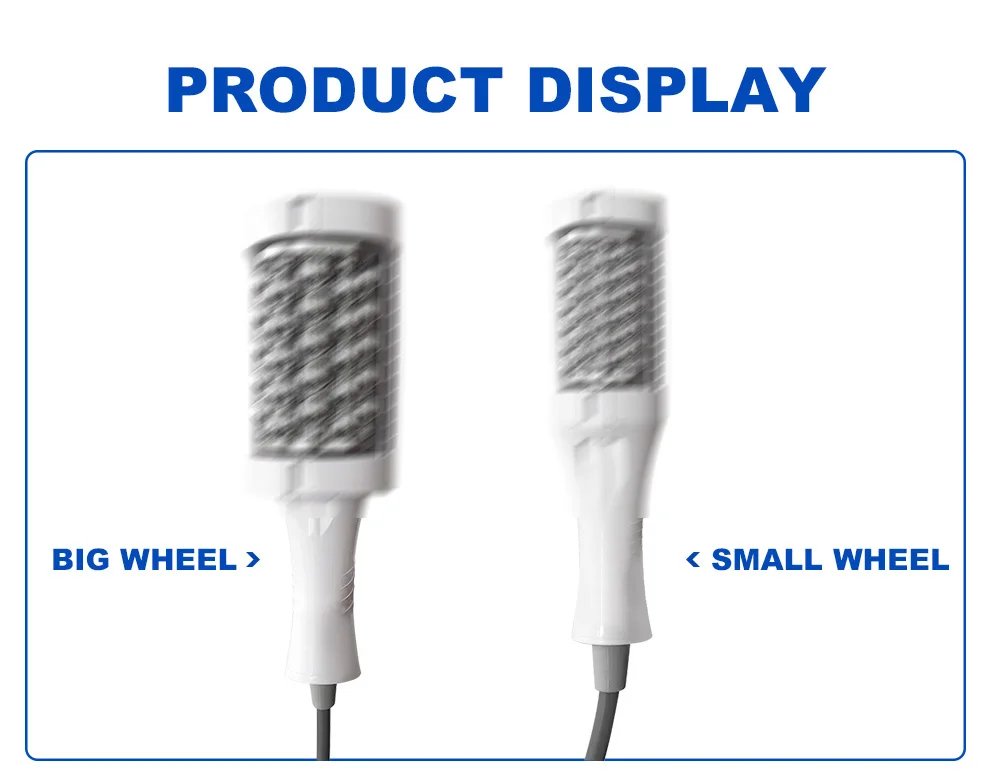 The roller part stimulates the skin and deep tissues by mechanical rolling and pushing. This massage technique helps to promote blood circulation and reduce the accumulation of subcutaneous fat. At the same time, roller massage can also effectively relieve muscles, relieve tension, help eliminate toxins and excess liquid in lymph, and then reduce edema and orange peel tissue.