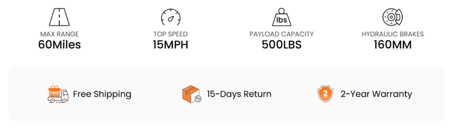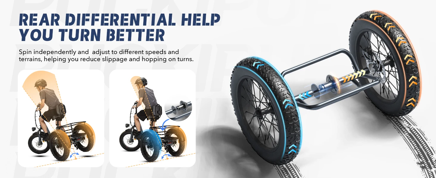 "Pickup" Class Trike: Three core advantages. First, it adopts a sturdy and durable aluminum alloy frame with a solid chassis and a weight capacity of up to 500 lbs (350 lbs standard weight capacity, 500 lbs maximum weight capacity). Second, equipped with a rear wheel differential, whether it is cornering, or through the complex road surface, you can get a more stable riding posture. Third, hydraulic brakes ensure safe riding, short braking distance and strong maneuverability!