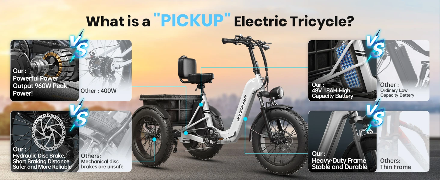 PUCKIPUPPY Electric Tricycle for Adult with 960W Peak Motor 60 Miles Range Pickup Class Trike 500 Lbs Load Electric Trike