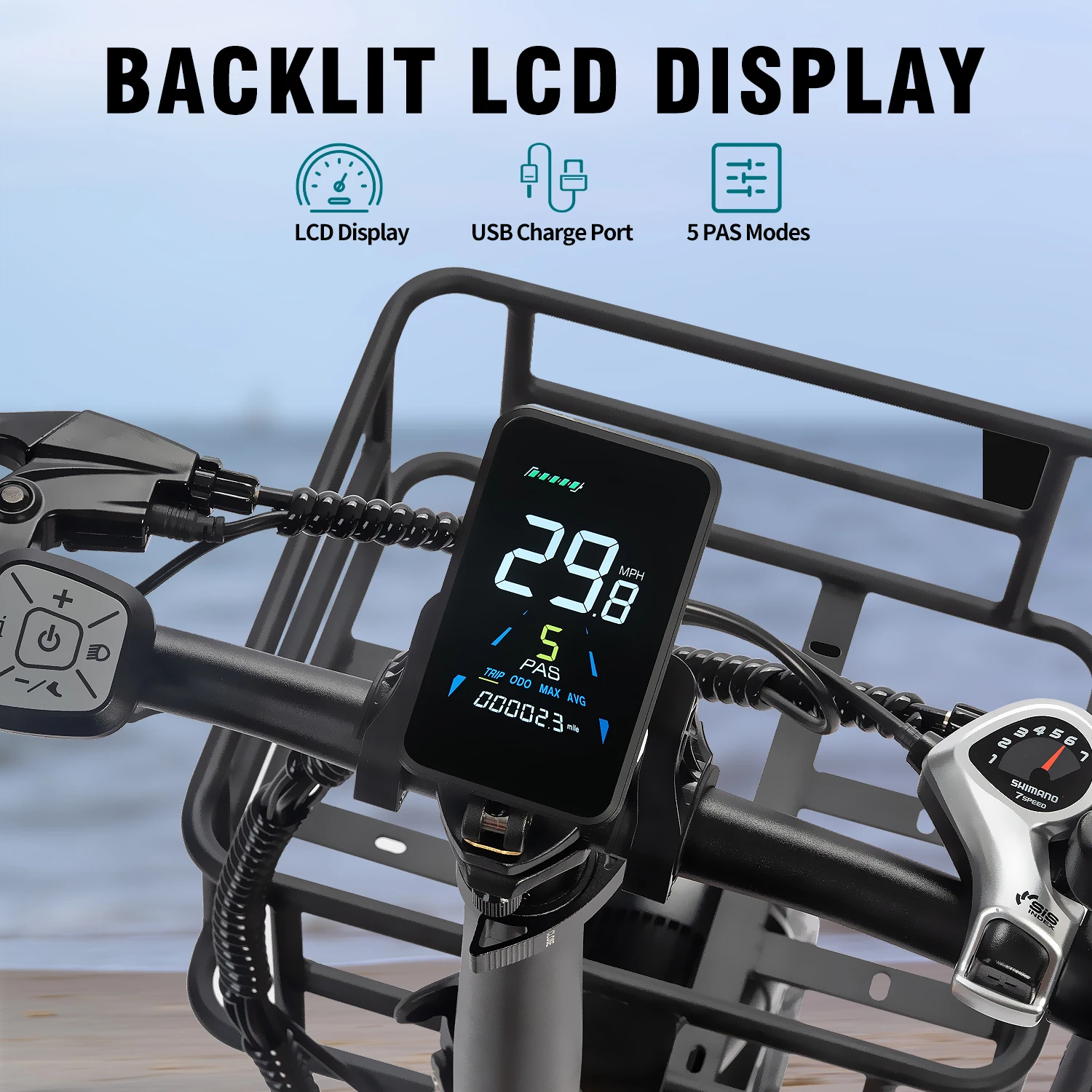 The Colorful LCD digital display provides clear visibility of speed, mileage, battery level, PAS, and other essential information.